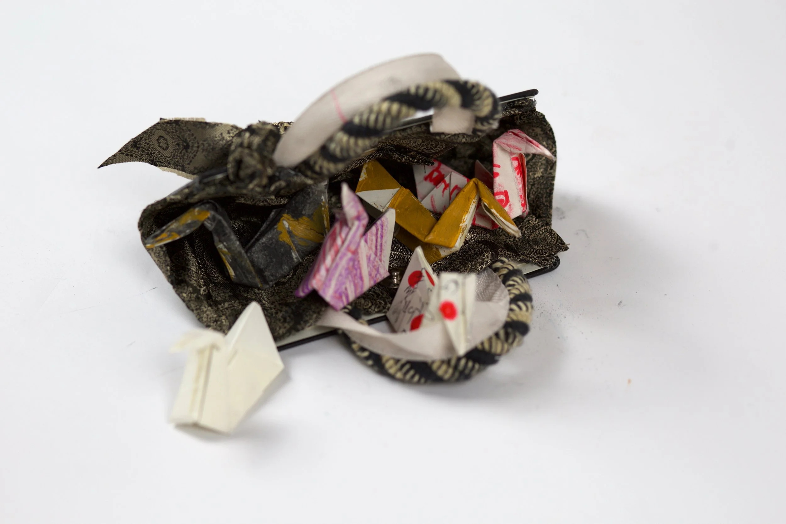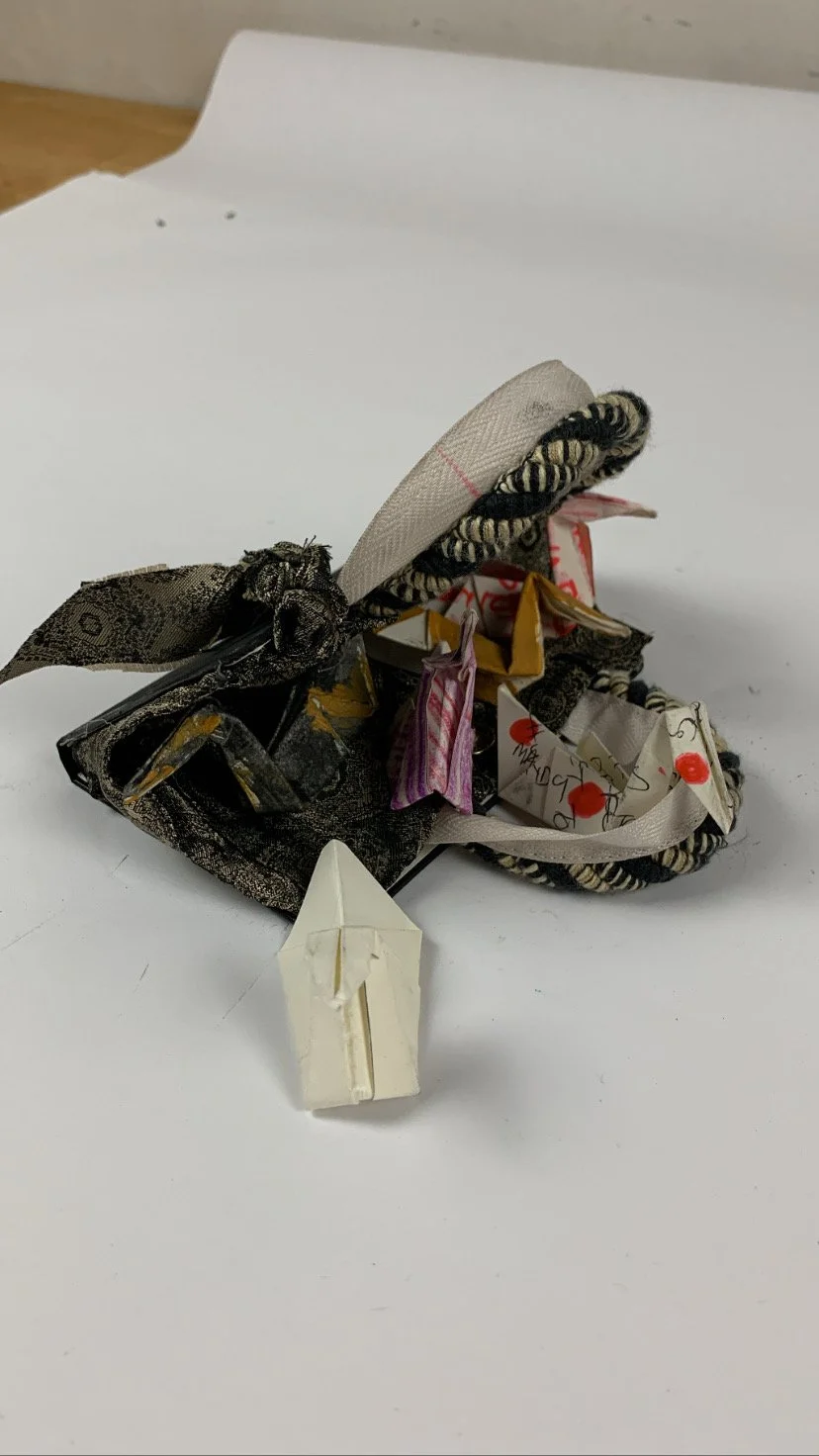 “A fully functional handbag fashioned from a notebook protects my seven swans of resilience. The handbag is the product of the work of these seven swans. As without their combined resilience none of this would be possible. Each swan represents a unique capacity of my personal resilience. Monica (My Grandmother), Mandy (My Mother), Path, Love, Inspiration, Creativity and Possibility. With this piece I tried to tie together the craft I have dedicated my life to and how it is the result of the work of my resilience. The Seven Swans of Resilience that have made it possible for me to be able to withstand any thunderstorm.”